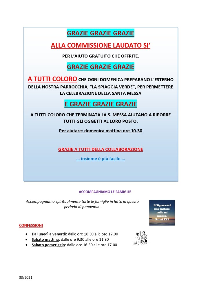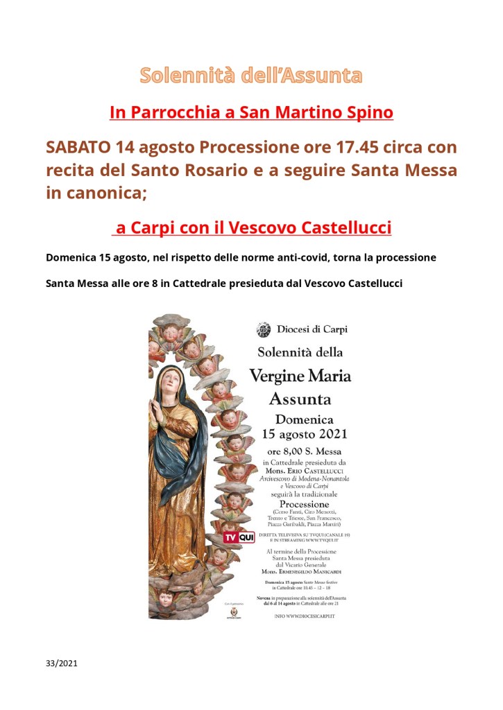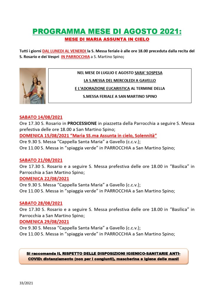 Settimanale sabato 14 agosto 2021 – domenica 22 agosto 2021 Pubblicato daparrocchiasms14 agosto 202113 agosto 2021Pubblicato in: Settimanale Correlati