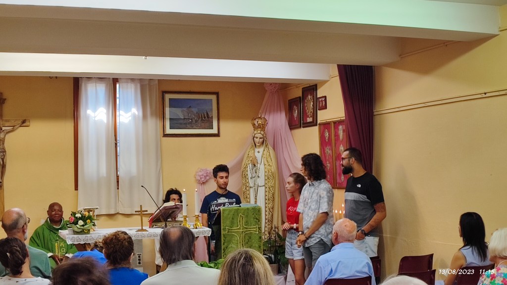 Tutti i giorni abbiamo avuto la grazia di poter avere un sacerdote che ha celebrato la Santa Messa. Abbiamo pregato ogni giorno, oltre alle intenzioni personali degli offerenti, per i nostri ragazzi in GMG a Lisbona e per i sacerdoti che li accompagnavano. Ogni due giorni circa abbiamo ricevuto notizie da Lisbona che abbiamo condiviso con la comunità sia in settimana che la domenica al termine della celebrazione della S. Messa. Abbiamo accompagnato la nostra parrocchia e tutti i ragazzi con la preghiera continua, con la partecipazione agli eventi attraverso la TV, la radio, WhatsApp, e c’è persino chi, come una signora anziana, che ha appositamente installato sul proprio cellulare un “app-social” che le permetteva di avere informazioni in tempo reale dei nostri amici in pellegrinaggio. Insomma non eravamo con voi ma siamo stati con voi. Abbiamo pregato con voi e per voi. Ogni giorno la nostra parrocchia è stata aperta alle ore 17:00 per l’Adorazione Eucaristica seguita dal S. Rosario e dalla S. Messa.