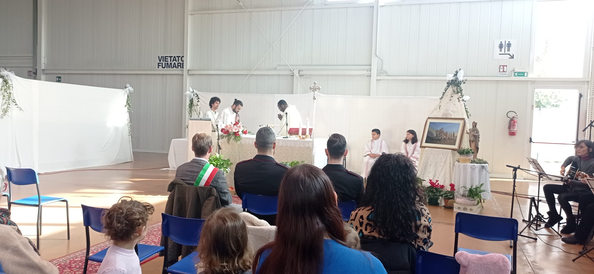 La Santa Messa celebrata dal nuovo parroco don Arnaud presso il Palaeventi alle ore 11:00, ha visto la presenza di un buon numero di fedeli, di famiglie e di bambini del catechismo che hanno, animato la liturgia mettendosi al servizio con entusiasmo: dai chierichetti alle letture delle preghiere dei fedeli, dal canto al momento dell’offertorio, portando all’altare i doni.