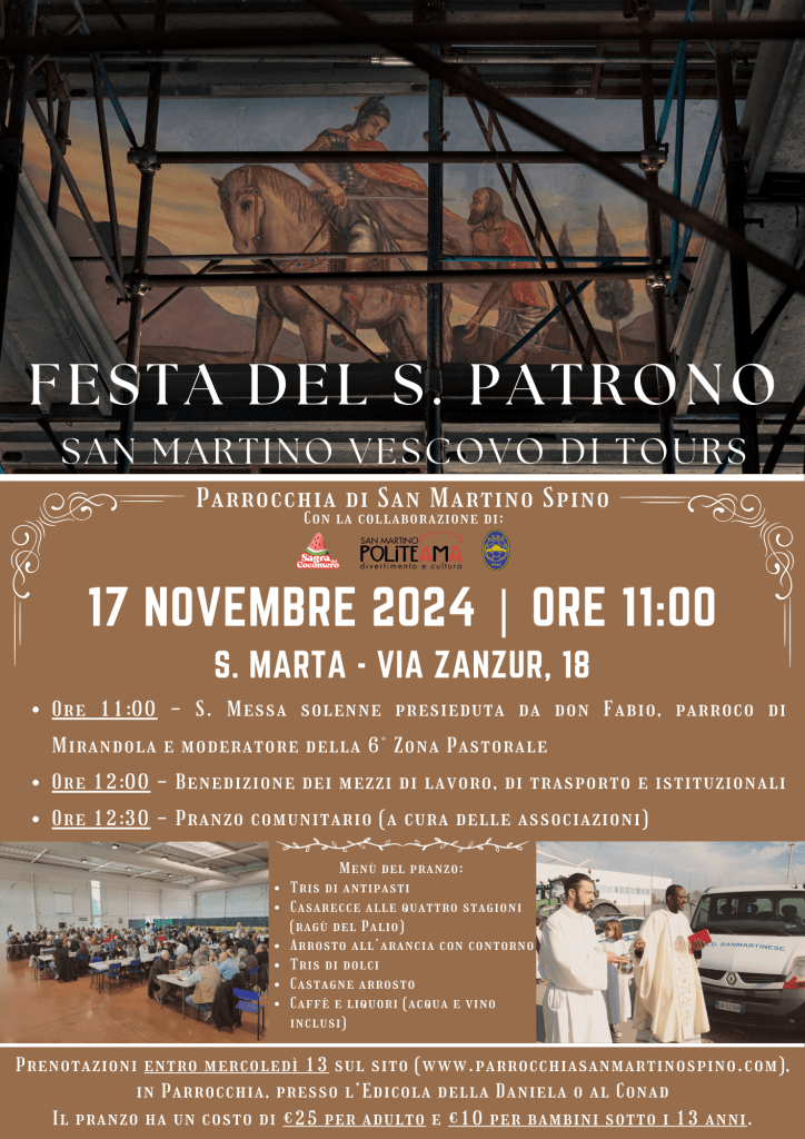 Terminata la benedizione, siete tutti invitati al pranzo comunitario di San Martino a cura delle tre associazioni sanmartinesi: la Sagra del Cocomero, il Circolo Politeama e l’ASD Sanmartinese. Per partecipare è necessaria l’iscrizione entro mercoledì 13 novembre, per permetterci di preparare il tutto.