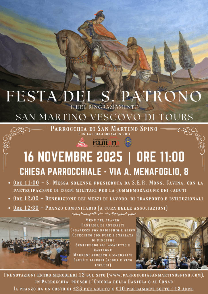 La tradizionale festa di S. Martino, patrono della nostra Parrocchia, si festeggerà nelle giornate di martedì 11 e domenica 16 novembre.