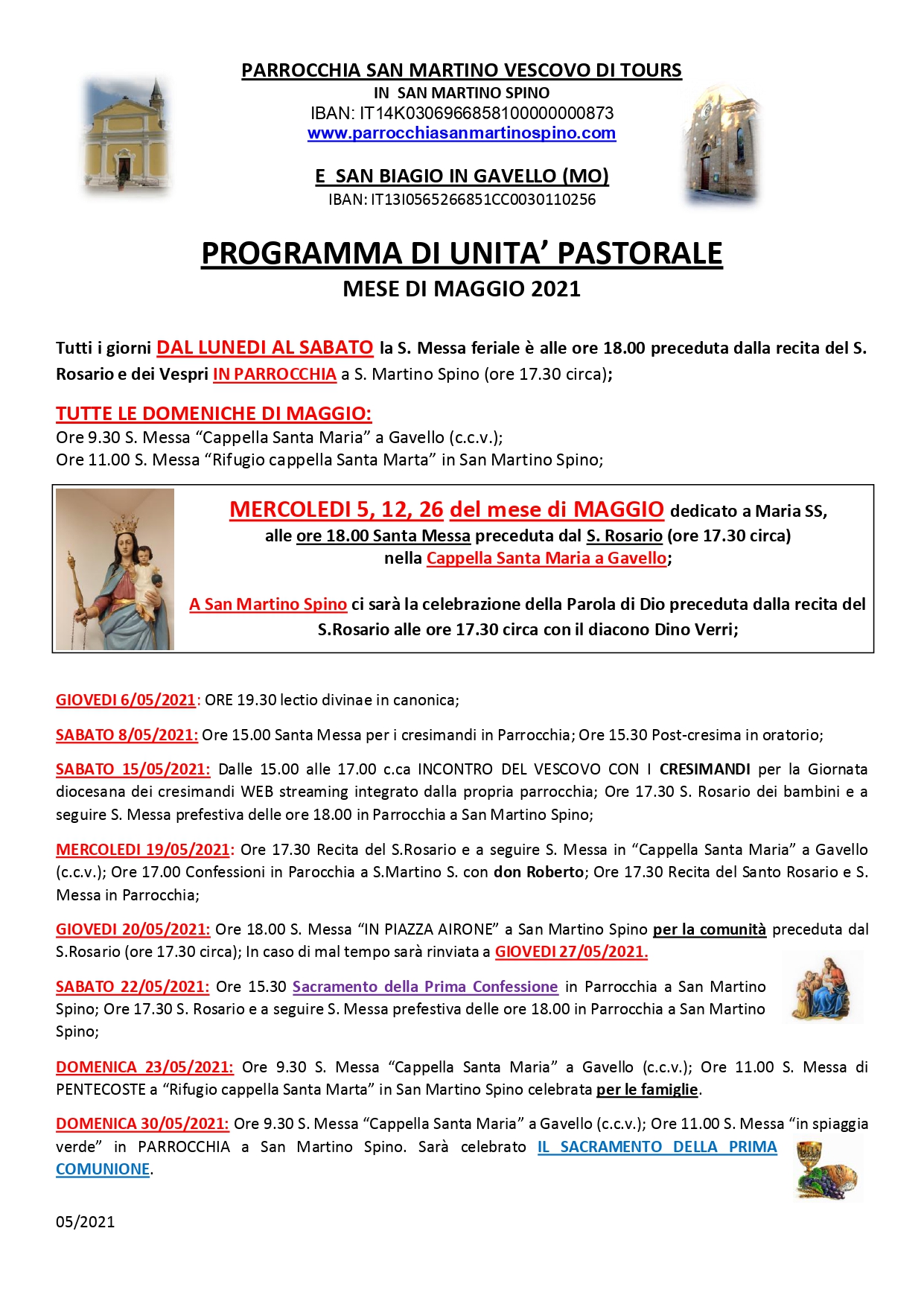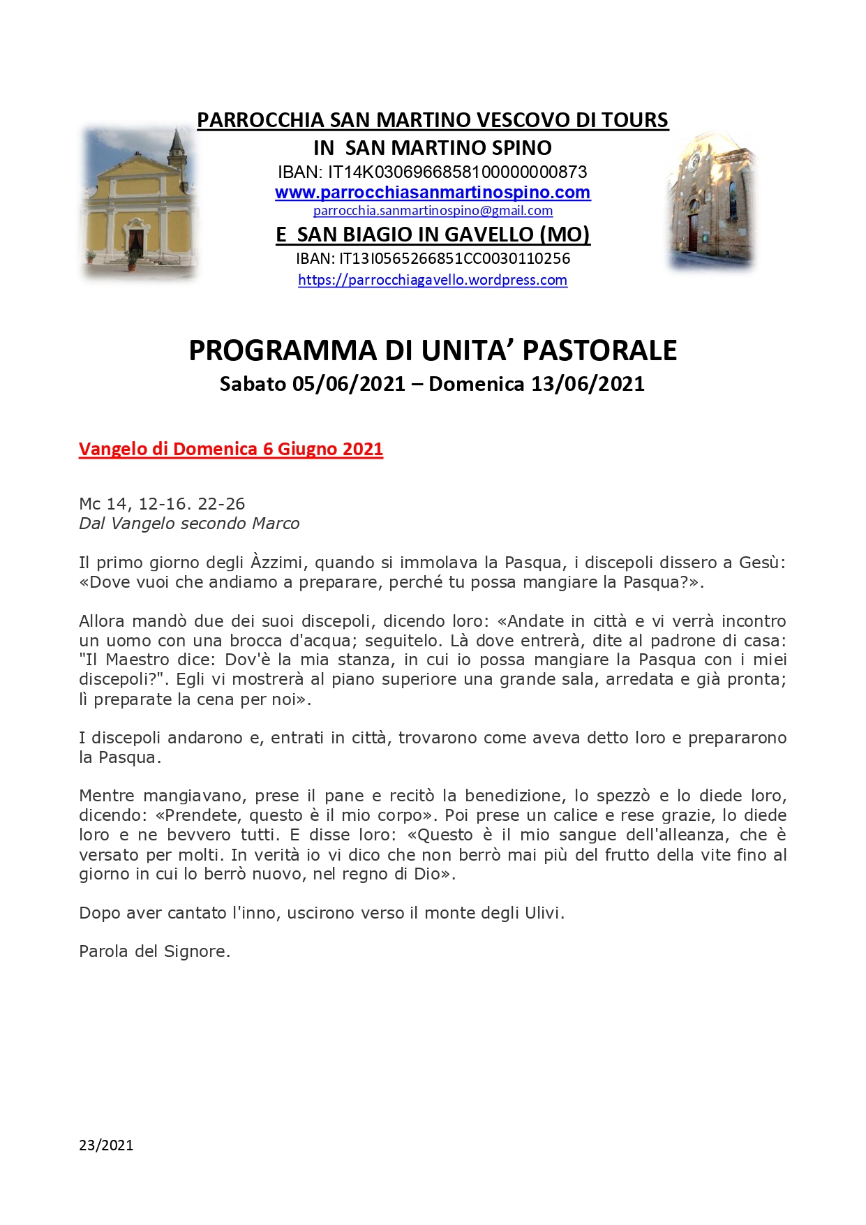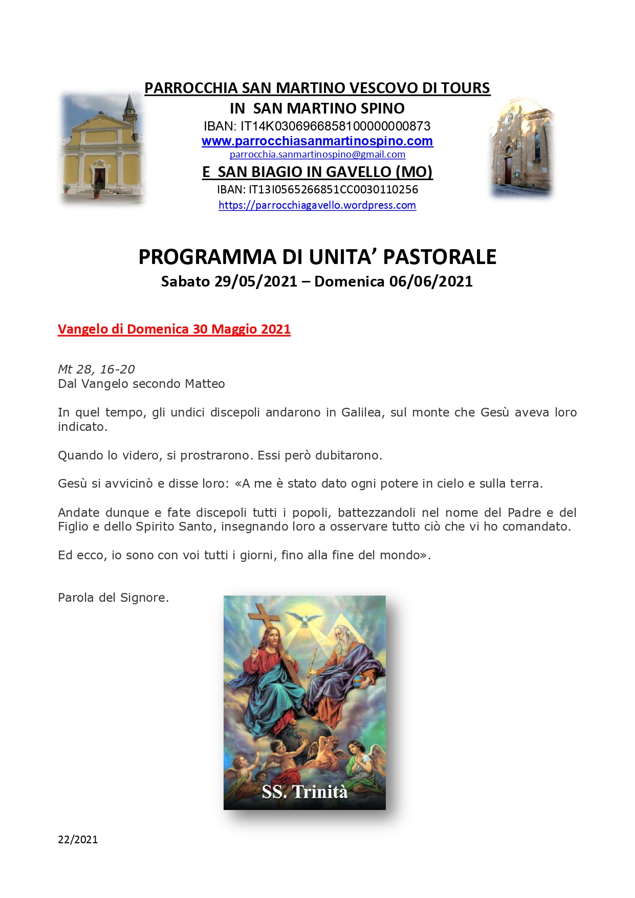 Settimanale sabato 22 maggio 2021 – domenica 30 maggio 2021