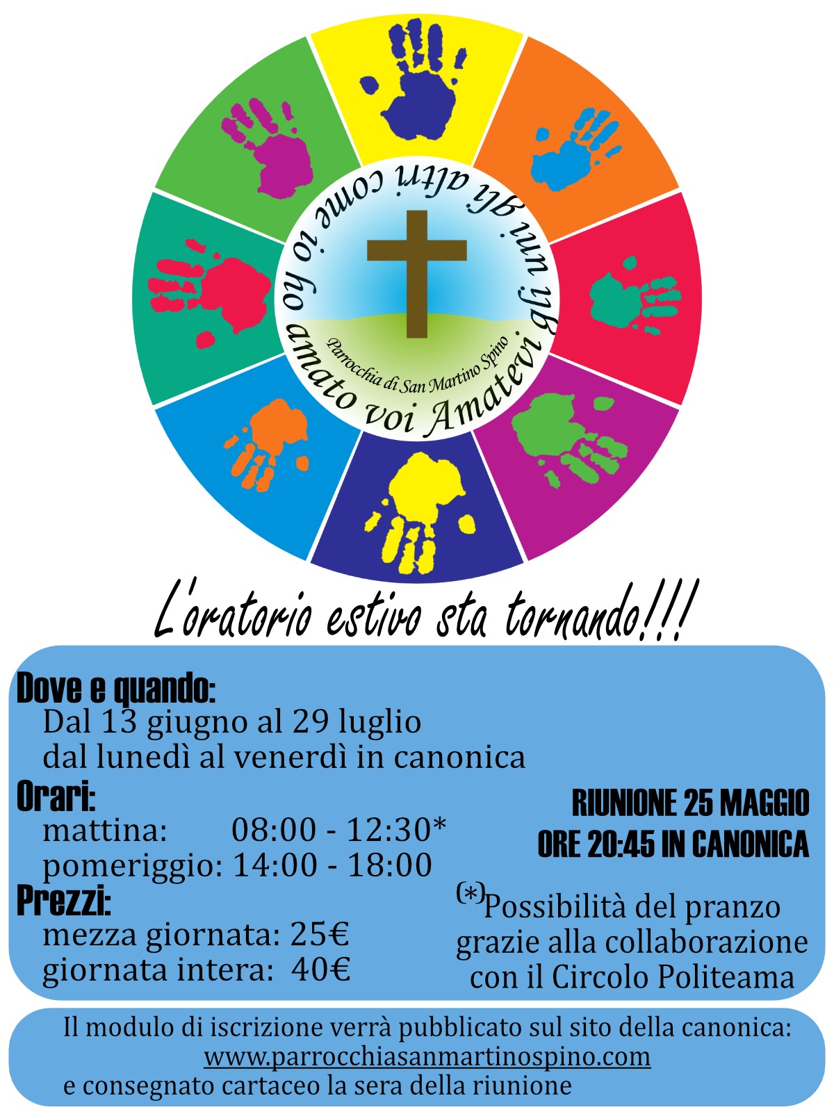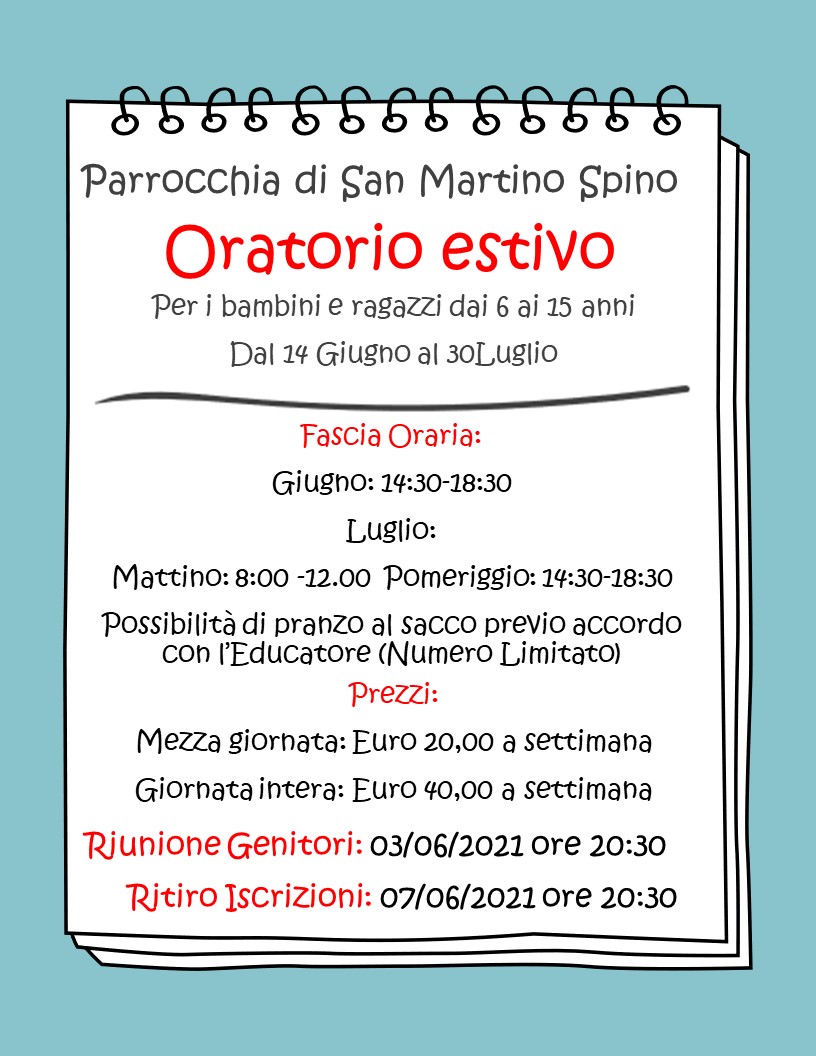 Come promesso e anticipato, parte l’Oratorio estivo 2021 della parrocchia di San Martino Spino! Tutte le informazione a riguardo saranno consultabili sul volantino (immagine soprastante) e chiediamo nuovamente scusa per i tempi stretti, è servito tempo per radunare idee ed educatori per partire anche questa estate con un progetto preciso che, per chi vorrà, spiegheremoContinua a leggere “Oratorio estivo 2021”