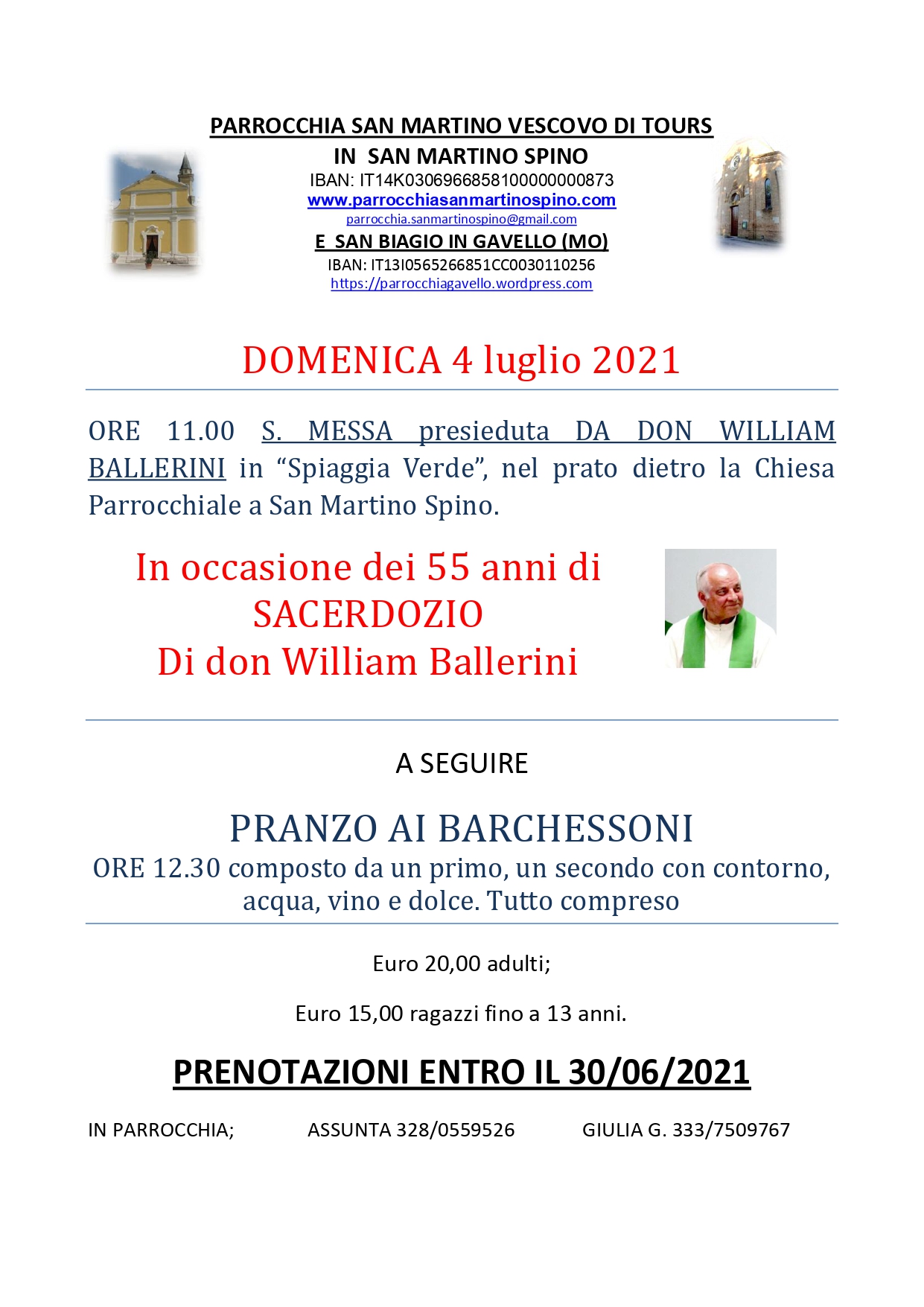 In occasione del suo 55esimo anniversario dalla prima messa celebrata qua a San Martino Spino, il nostro parroco Don William torna in mezzo a noi per celebrare la S. Messa a lui dedicata. La funzione avverrà come ogni domenica alle 11 in “Spiaggia verde”, con l’aggiunta di un pranzo comunitario ai Barchessoni da prenotare entroContinua a leggere “55° anniversario di sacerdozio di Don William”